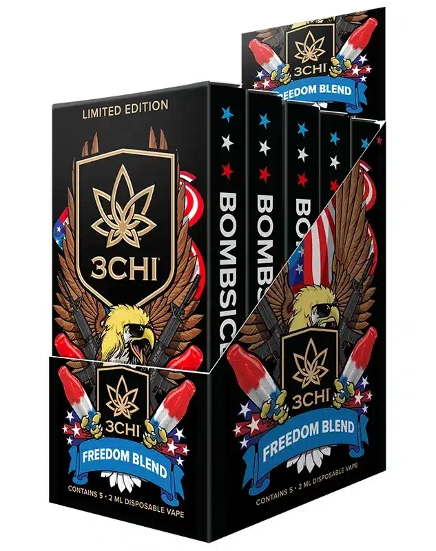 This highly potent Freedom Blend 2ml disposable vape delivers a star-spangled euphoria, combining THCA, THCP, THC-C8, HHC, ∆8, and other curated cannabinoids with a delicious Bombsicle flavor. Enjoy a premium vaping experience with 3 variable heat settings and preheat functionality, ensuring top-tier flavor and effects.